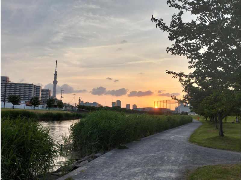 旧中川の芝生の上で、暮れていく空とライトアップされていく東京スカイツリーの変化を眺めながら、ゆったりヨガを楽しみます。