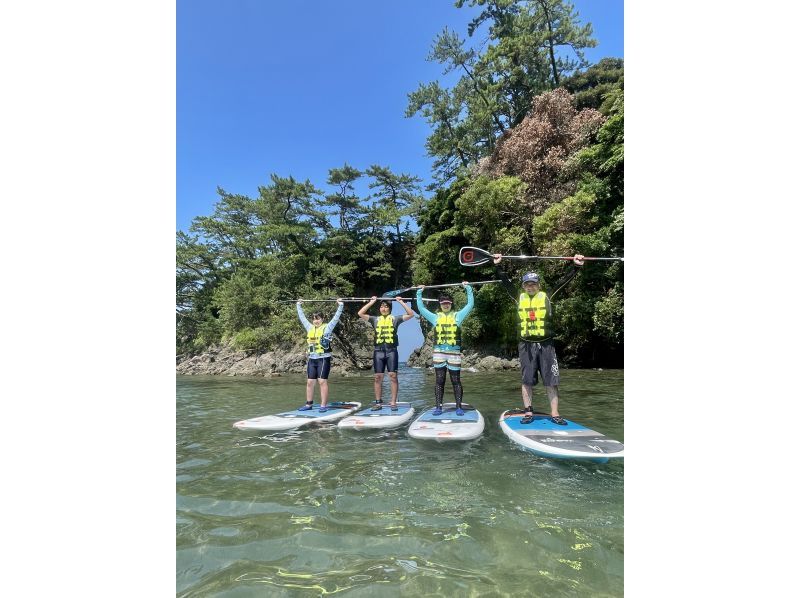 若狭湾の澄んだ海面をSUPで水上散歩。目的地は葉積島、明鏡洞。記念撮影して夏の思い出を作りましょう。