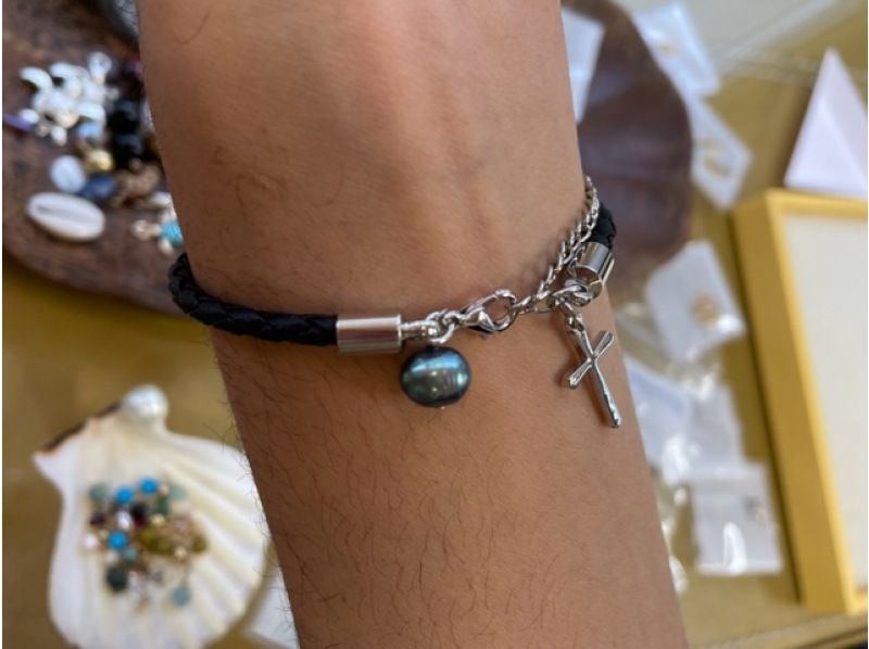 お客様の作品1 革ひも「黒」、金具はシルバー色、チャームはクロスチャーム、淡水パール、星チャームを使用 革ひも部分には何もつけず、金具部分に、淡水パールとクロスチャームをつける事で、見える角度からはただの革ひもブレスレットにみえ、違う角度からはチャームがついたブレスレットに見える、かっこいい作品になりました