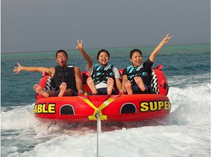 恩納村沖でマリンスポーツを体験。エメラルドグリーンの沖縄の海を爽快に駆け抜けるアクティビティです。ジェットスキーやバナナボート、マーブルの中からお好きな物を2つ選んで体験できます。