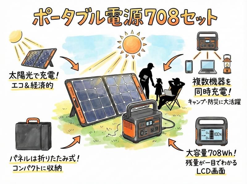 また、この2つを組み合わせることで、日中にソーラーパネルで集めた電気をポータブル電源に蓄電することができます。