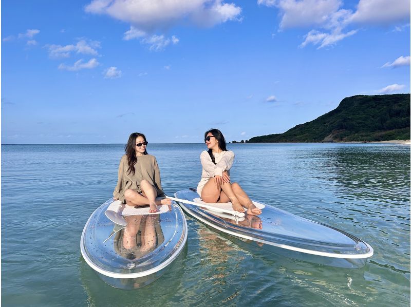 透明なSUPボードの上に立ち、足元から広がる宮古ブルーの海を間近に感じられます。