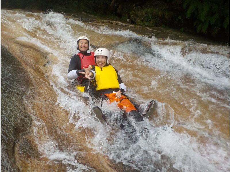 キャニオニングスマイルコースは通常行われる、半日コースの内容をギュギューっと凝縮した価格も内容もスマイルなコースです。定番の遊びである、川流れ、飛び込み、スライダーは必ず体験できます。