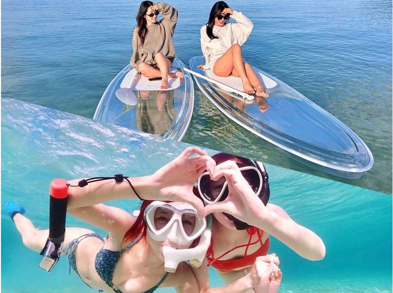 ウミガメと泳ぐシュノーケリングと、透明なボードで海の上を進むクリアSUP体験をまとめて楽しめます。