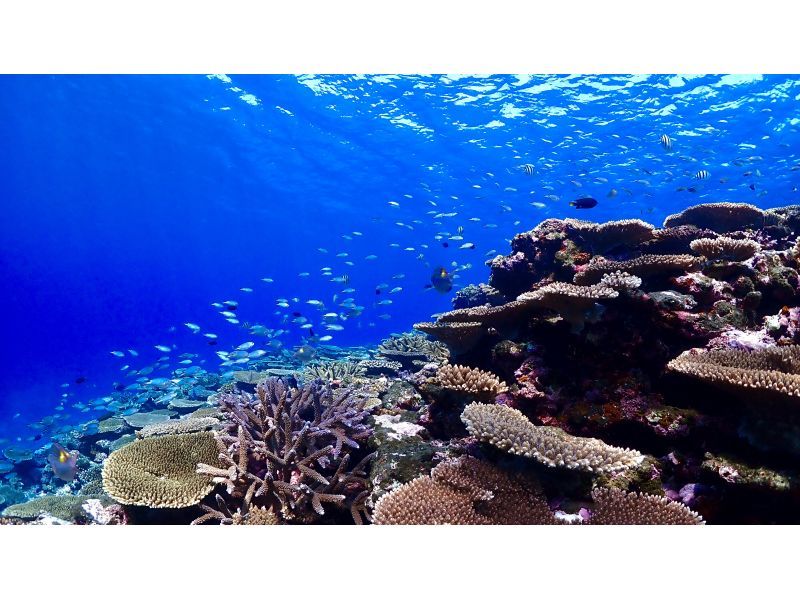 枝サンゴやテーブルサンゴが重なり合い、まるで天然の水族館のような景色が広がります。