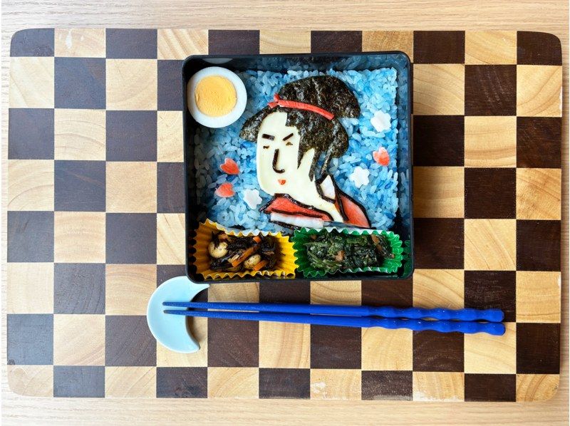 Using rice as your canvas, you will design a female portrait with expressive facial features and a traditional hairstyle, bringing the world of Japanese art to life through food. The combination of vividly colored blue rice (made with butterfly pea) and thoughtfully arranged ingredients results in a colorful and eye-catching bento.